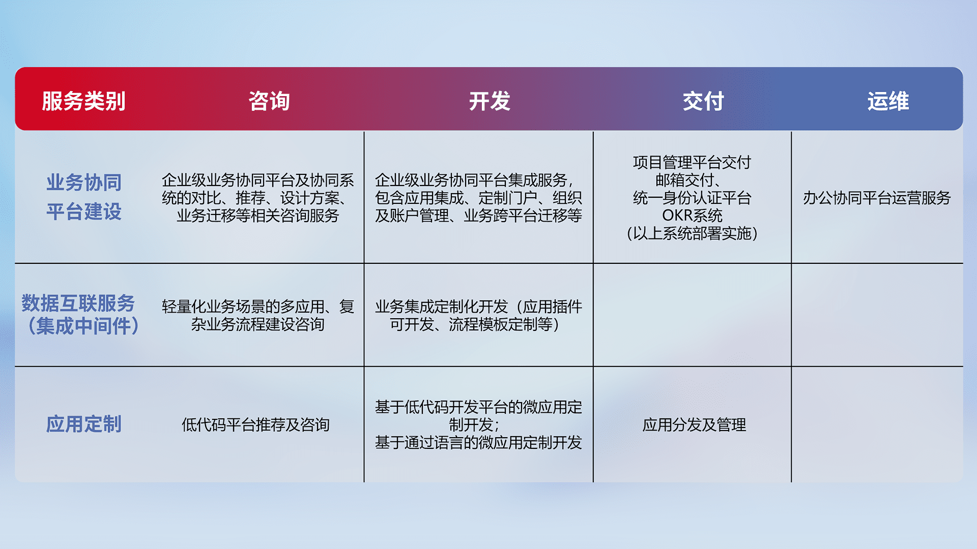 针对钉钉、、、、企微、、IDaas等平台级产品提供产品的规划、、方案、、、交付、、定制化开发等服务,,,实现如统一协同办公、、智能客户服务、、、、混合会议管理、、智能数据查询、、等业务场景,,,实现数字化转型。。。。